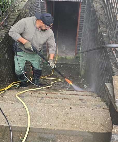 Um die Treppe gründlich von den Einflüssen der Witterung zu befreien, wurde sie sorgfältig mit einem Hochdruckreiniger gereinigt. Diese Methode gewährleistet eine effektive Entfernung von Schmutz, Ablagerungen und anderen Umwelteinflüssen, die sich im Laufe der Zeit angesammelt haben.